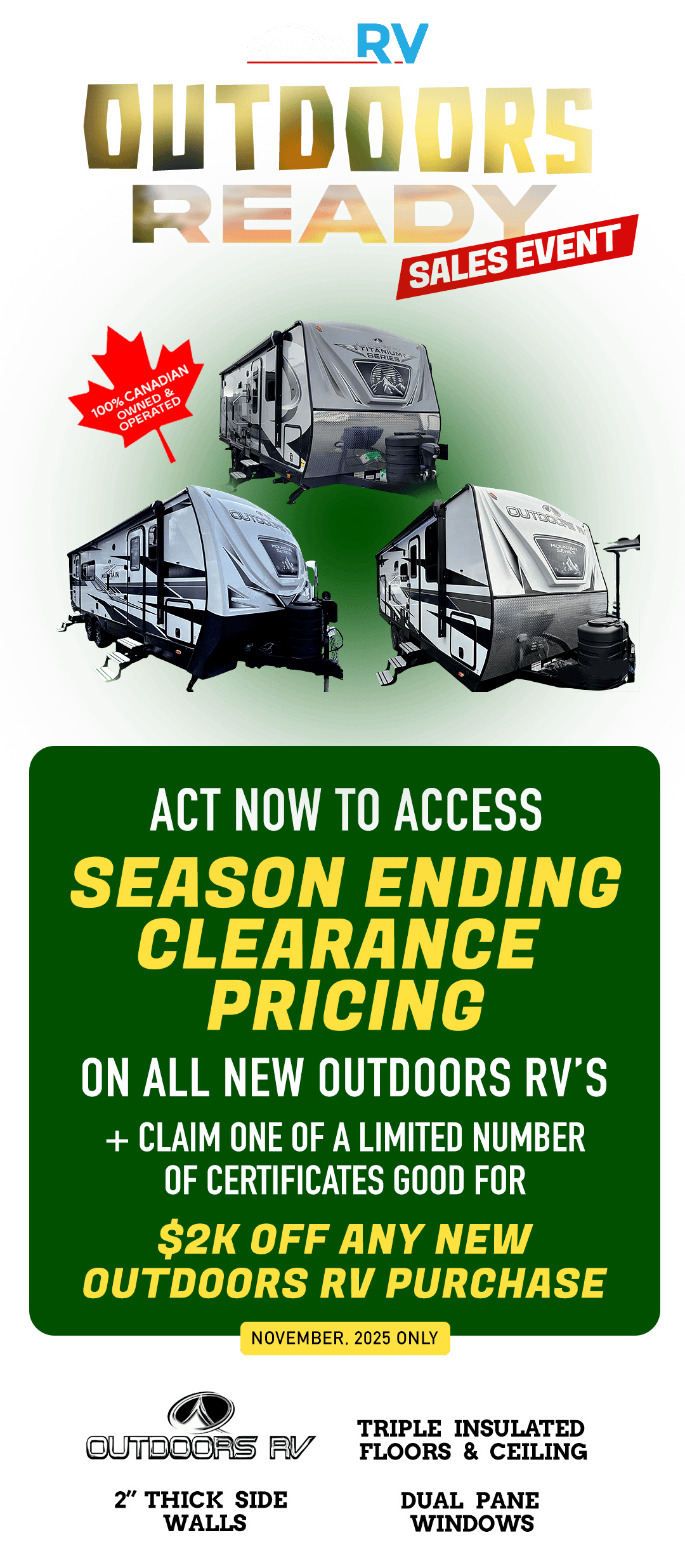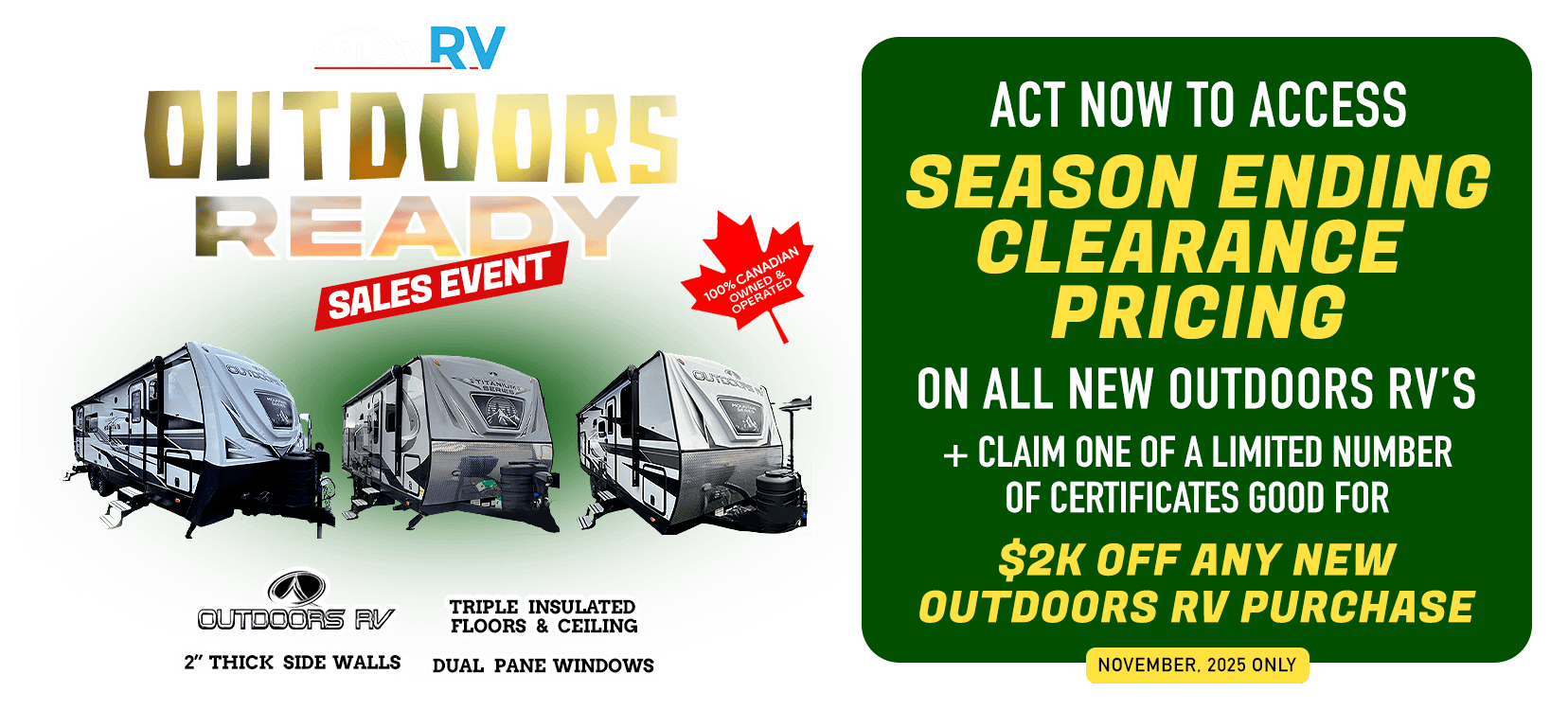 Galaxy RV reserves the right to terminate this offer at any time without prior notice. Other conditions apply. Contact your nearest Galaxy RV location for further details.